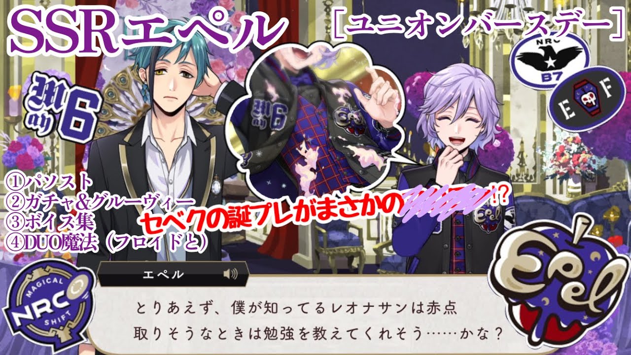 ツイステ エペルの誕生日を記念して、期間限定ガチャで実装されたSSRエペル[ユニオンバースデー]のパソスト、ガチャ&グルーヴィー、ボイス、DUO魔法(フロイドと)のまとめ動画です。