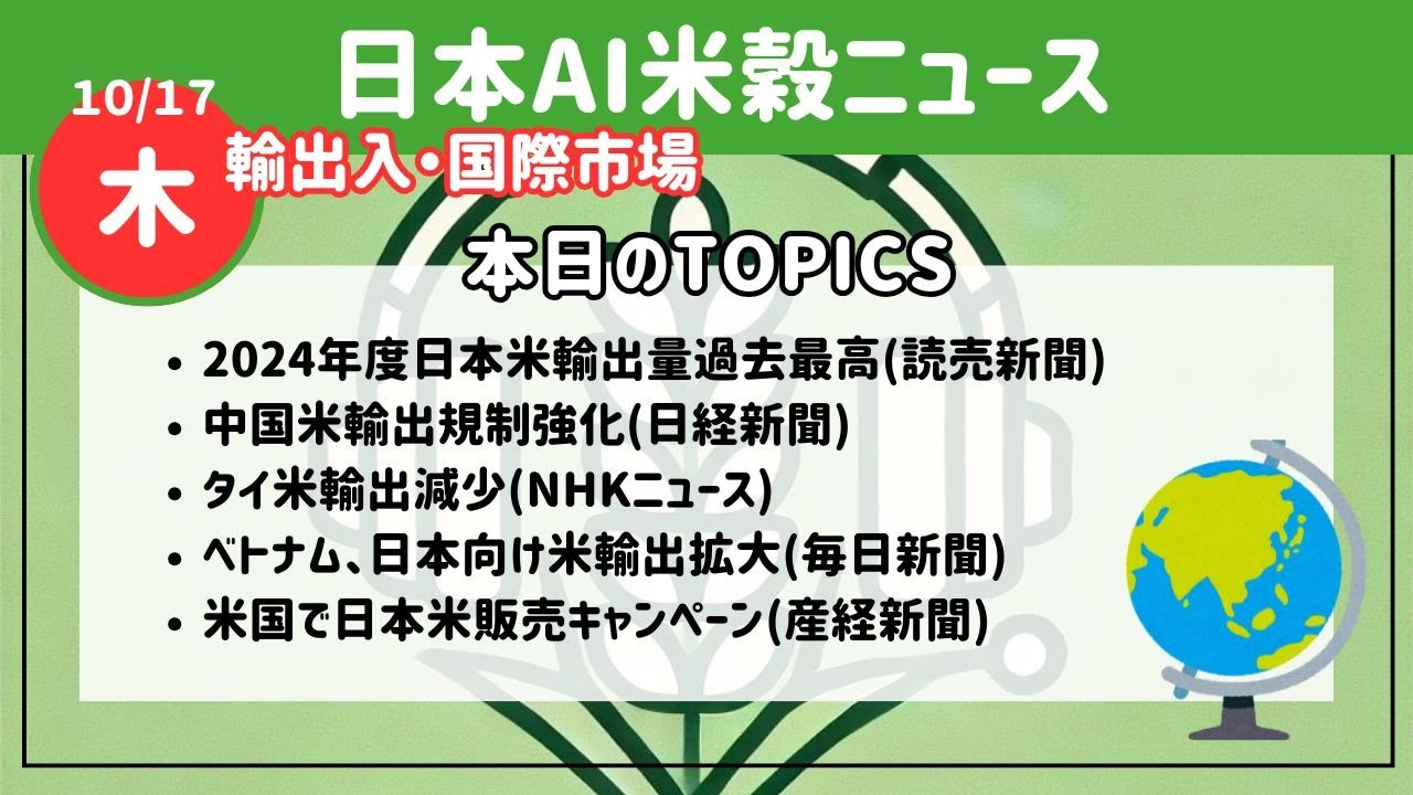 ・2024年度日本米輸出量過去最高(読売新聞)・中国米輸出規制強化(日経新聞)・タイ米輸出減少(NHKニュース)・ベトナム、日本向け米輸出拡大(毎日新聞)・米国で日本米販売キャンペーン(産経新聞) ニュース X Facebook Hatena Bookmark Pocket LINE Copy 2025/7/24 🌾新聞社をはじめとする、主食コメの国内最新ニュースをAIが集めました。 ながら聞きでチェック🎧 #米穀AIニュース X(Twitter):https://x.com/ai_beikoku_news ※この番組はAI技術を活用して自動的に生成しています。ニュースの正確性には十分注意していますが、必ず公式な情報源を確認してください。 VOICEVOX:後鬼