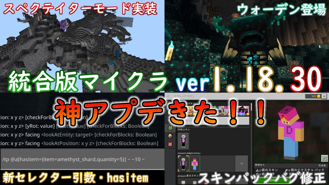【統合版マイクラ】Ver1.18.30 神アプデ!スペクテイターモード実装に新セレクター引数「hasitem」にウォーデンまで登場!【Switch/Win10/PE/PS4/Xbox】