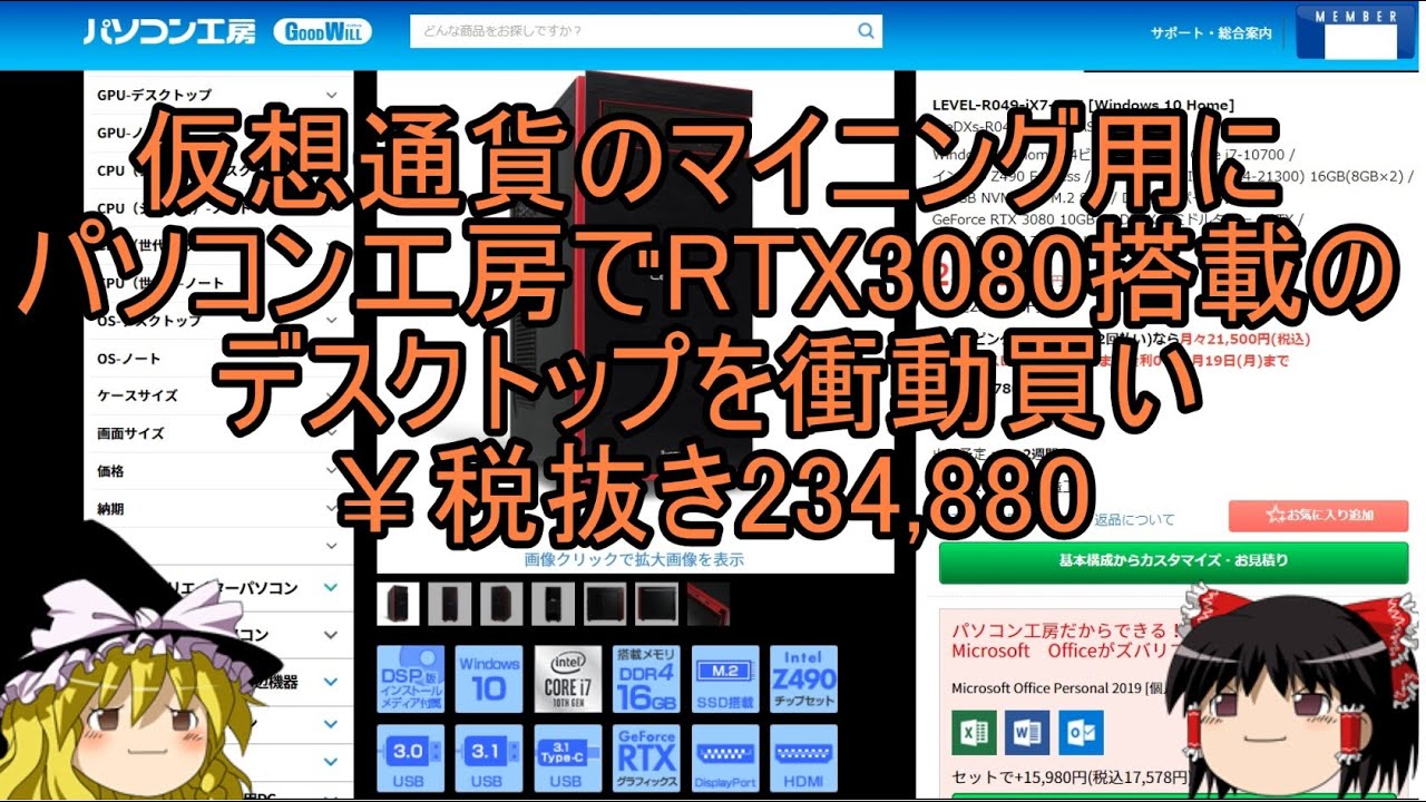 RTX3080搭載 234,880円マイニング用にデスクトップPCを買う 仮想通貨 X Facebook Hatena Bookmark Pocket LINE Copy 2025/9/20 GPU不足の世の中でも価格設定が人道的なパソコン工房でBTOデスクトップを買いました。NiceHash でマイニングしたいと思います。#マイニング#自作PC
