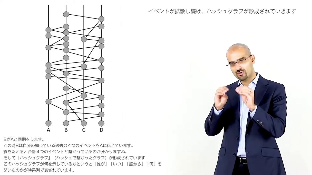 BがAと同期をします。この時Bは自分の知っている過去の4つのイベントをAに伝えています。線をたどると合計4つのイベントと繋がっているのが分かりますね。そして「ハッシュグラフ」(ハッシュで繋がったグラフ)が形成されています。このハッシュグラフが何を示しているかというと「誰が」、「いつ」、「誰から」、「何を」聞いたのかが時系列で表されています。